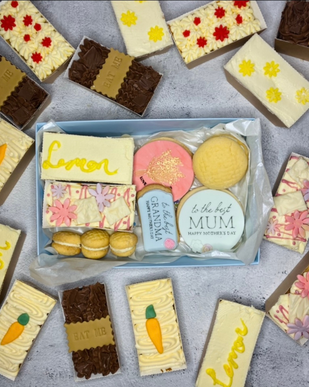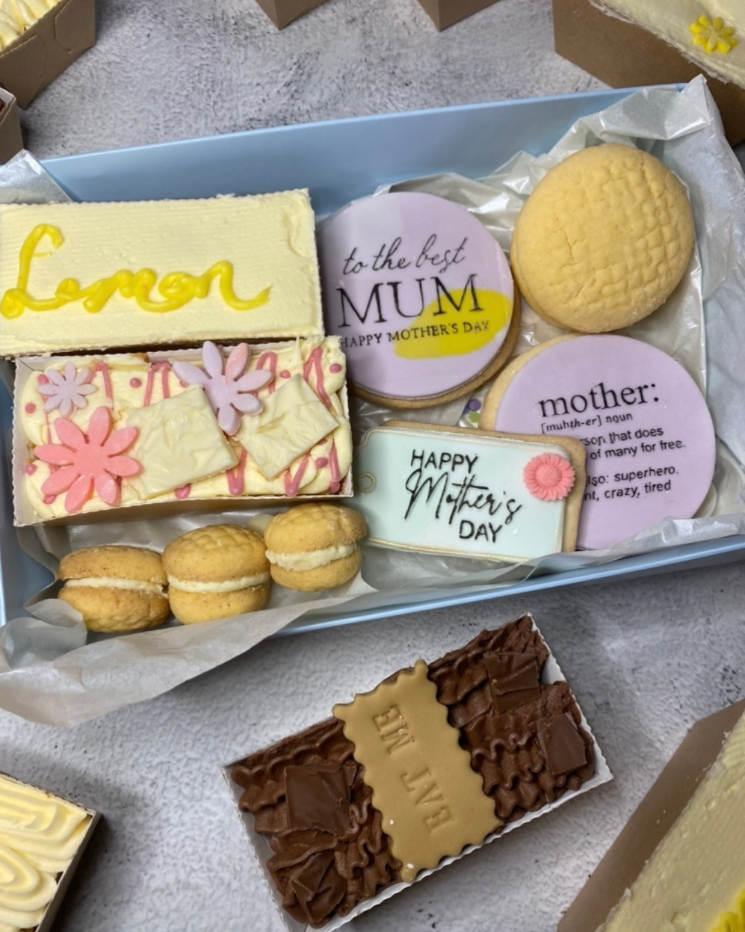 3 handmade and handpainted vanilla cookies. When you select your box variant it will allow for customisation of the theme (eg: Mum's The Word box is for Mothers, New Mum is personalised for a new mum etc).